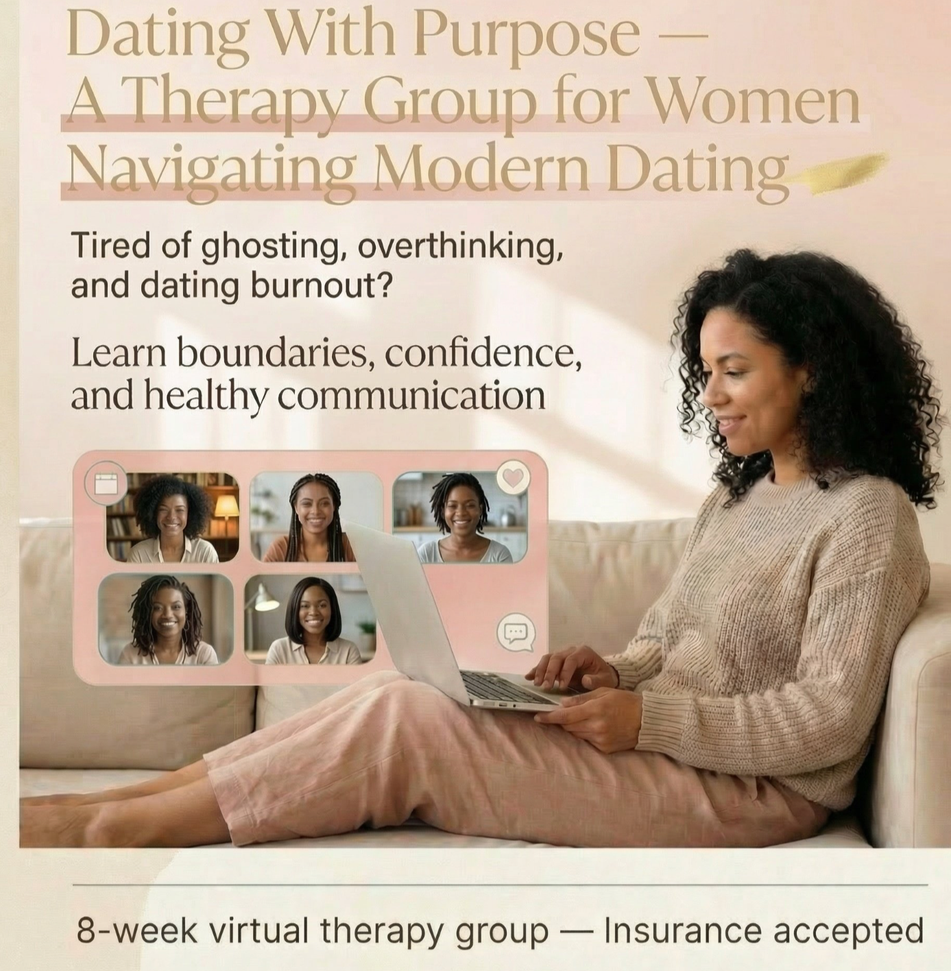 Dating With Purpose is an 8-week therapy group designed for women who want healthier, more intentional relationships without losing themselves in the process.
